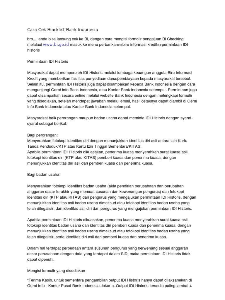 Maka dari itu simak cara cek online nama anda dan solusi jika anda mendapat blacklist BI Checking berikut ini. BI Checking adalah sebuah istilah yang populer dari data riwayat peminjaman kredit seseorang pada semua bank dan lembaga pemberi kredit lainnya, yang di simpan oleh Bank Indonesia dalam sebuah database sistem informasi debitur (SID).