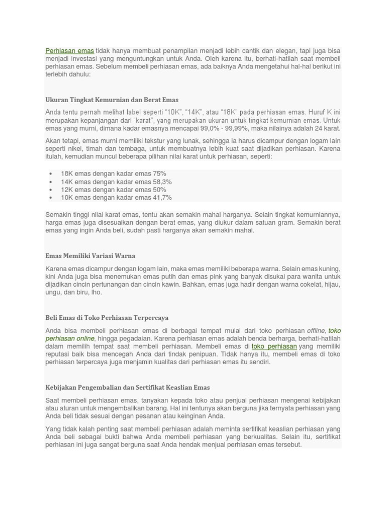 Menurut ahli perhiasan dunia, emas 18 karat merupakan kadar kemurnian ideal untuk perhiasan. Kandungan emas sebanyak 75% dinilai sebagai kombinasi sempurna untuk mempertahankan perhiasan tetap cantik dalam waktu lama. Selain itu, emas 18 karat tidak mudah berubah bentuk selama proses pembuatan perhiasan, kuat, dan bernilai tinggi. Kadang-kala, emas 18K ditandakan dengan 750, 0.75 atau cop yang serupa dengannya untuk melambangkan bahawa barang kemas mengandungi 75% emas. Bagaimana kehalusan emas dikira? Di Barat, karat dinyatakan dalam kehalusan. Contohnya, emas 24K dinyatakan sebagai 1,000 bahagian daripada 1,000 ketulenan, atau kehalusan 1.000. Karat merupakan tingkat keaslian emas, atau jumlah kandungan kemurnian emas. Kadar emas dalam "karat". Kadar 24 karat dinyatakan sebagai emas murni. Jadi emas kadar 23 karat berarti tingkat kemurniannya adalah 23/24 X 100% atau sekitar 95,8%. Jadi bila emas kadar 22 karat dengan berat 15 gram maka kandungan emas murninya = 22/24 x 15 = 13.75 Gram. Penjelasan Lengkap Perbedaan Emas Karat 9 Carat - 24 Carat. Memahami perbedaan emas itu penting guna mencegah terjadinya hal-hal yang kurang mengenakkan terkait transaksi jual beli emas itu sendiri. Jika Anda pernah berbelanja perhiasan, mungkin tidak asing lagi dengan kata "karat" yang biasa digunakan dalam menentukan kualitas atau kadar ...