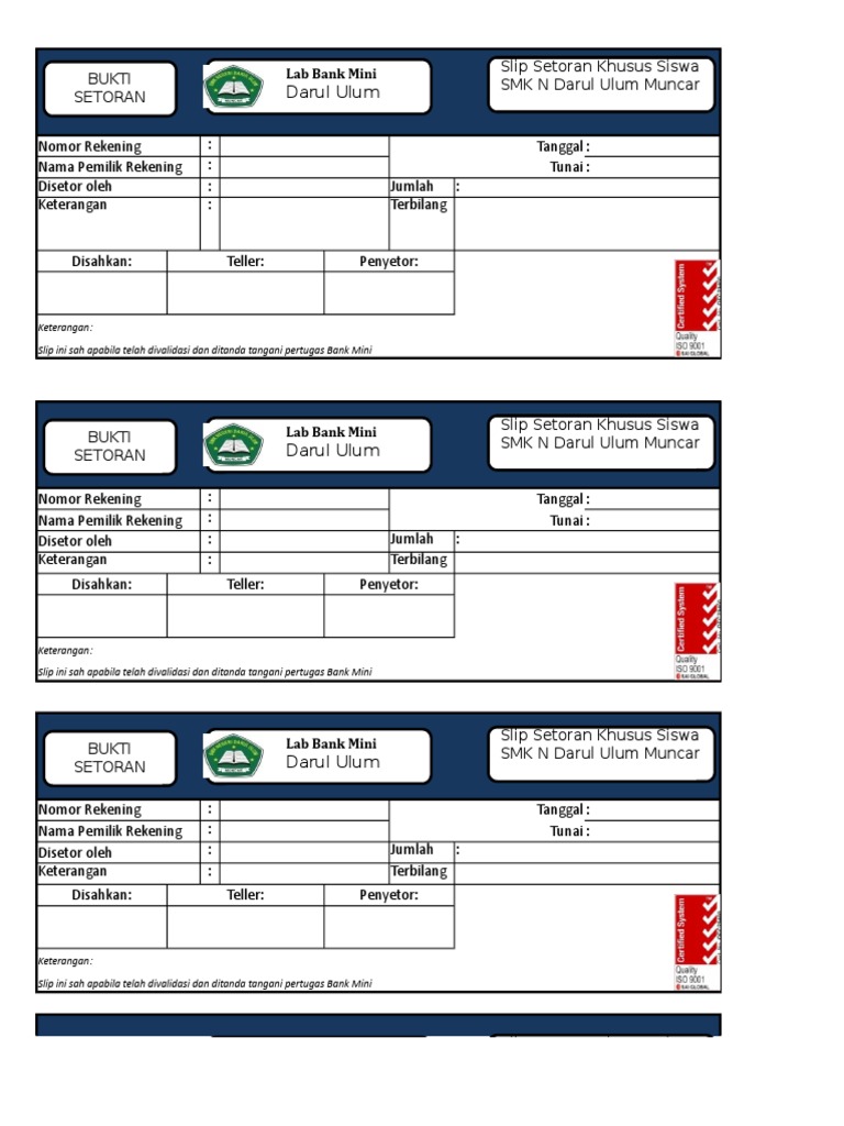 Contoh Slip Pembayaran atau Bukti Transaksi dalam from 4.bp.blogspot.com Serahkan slip dan jumlah setoran kepada teller bri . Diteruskan oleh tersangka ke rekening pribadinya pada bank bri & bank bca. Setoran tunai melalui teller dilakukan pengisian slip penyetoran (warnabiru) dengan contoh sebagai berikut : Ingin memberikan contoh tahapan ... 7. Contoh Soal Rekonsiliasi Bank Beserta Pembahasannya. Setelah mengetahui penjelasan tentang rekonsiliasi bank, maka selanjutnya kami akan memberikan contoh rekonsiliasi bank dan pembahasannya. Untuk lebih jelasnya silahkan simak pembahasan berikut. Agus memiliki saldo rekening bank di buku besar PT. Martech pada tanggal 30 November 2018. Datanglah ke bank, jangan datang ke warung bakso ya :D; Ambil slip penyetoran. Slip penyetoran. Ada 2 warna, yang satu warna biru dan warna kuning. Kalau warna biru nanti disimpan bank, yang kuning kita simpan sebagai bukti transfer. Isikan kota, tanggal, bulan dan tahun. Isikan jenis tabungan anda. sebagai bukti pencatatan penerimaan uang. Contoh Kwitansi. 2. Cek (Cheque). Cek adalah surat perintah pembayaran kepada bank dari orang yang menandatangani ...