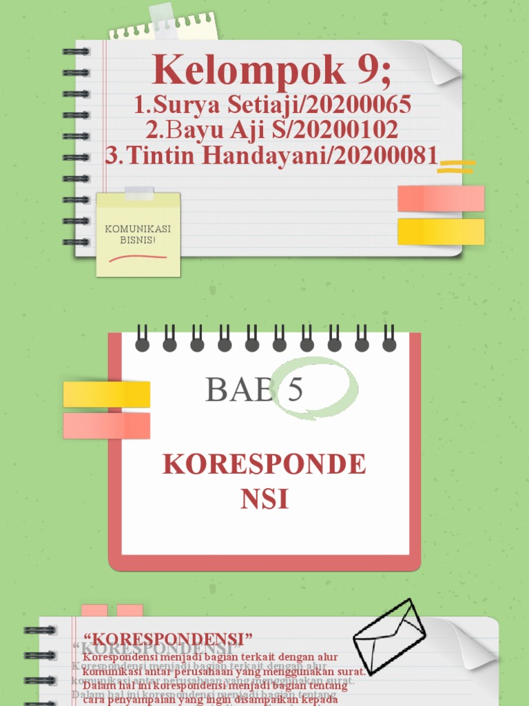 Kaitan korespondensi dengan kegiatan komunikasi bisnis.. Komunikasi Bisnis merupakan komunikasi yang digunakan untuk membangun hubungan antar perusahaan dalam dunia bisnis. Hal ini dilakukan guna saling mempromosikan atau mempresentasikan suatu nilai produk atau jasa yang dimiliki oleh perusahaan kepada pihak buyer maupun perusahaan... Bahasa korespondensi Bisnis Korespondensi bisnis atau surat-menyurat bisnis memiliki bahasa 1.3 PENTINGNYA KORESPONDENSI BISNIS Beberapa survey mengenai transaksi bisnis internasional 1.4 PERANAN KORESPONDENSI DALAM BISNIS Korespondensi atau kegiatan... ž Surat bisnis adalah surat yang digunakan oleh seseorang, lembaga organisasi, atau institusi untuk menyampaikan pesan-pesan bisnis secara tertulis kepada pihak lain dengan pihak-pihak tertentu. a. Surat bisnis berfungsi sebagai wakil atau duta bagi pengiriman surat. b. Alat untuk menyimpan... Kegiatan korespondensi secara tidak langsung merupakan proses pembelajaran dalam menciptakan surat yang baik, jelas, dan tepat. Agar bisa bekerja sama dengan pihak lain, perusahan perlu menjaga komunikasi dengan baik. Pihak lain akan mendukung terciptanya kerja sama yang baik.