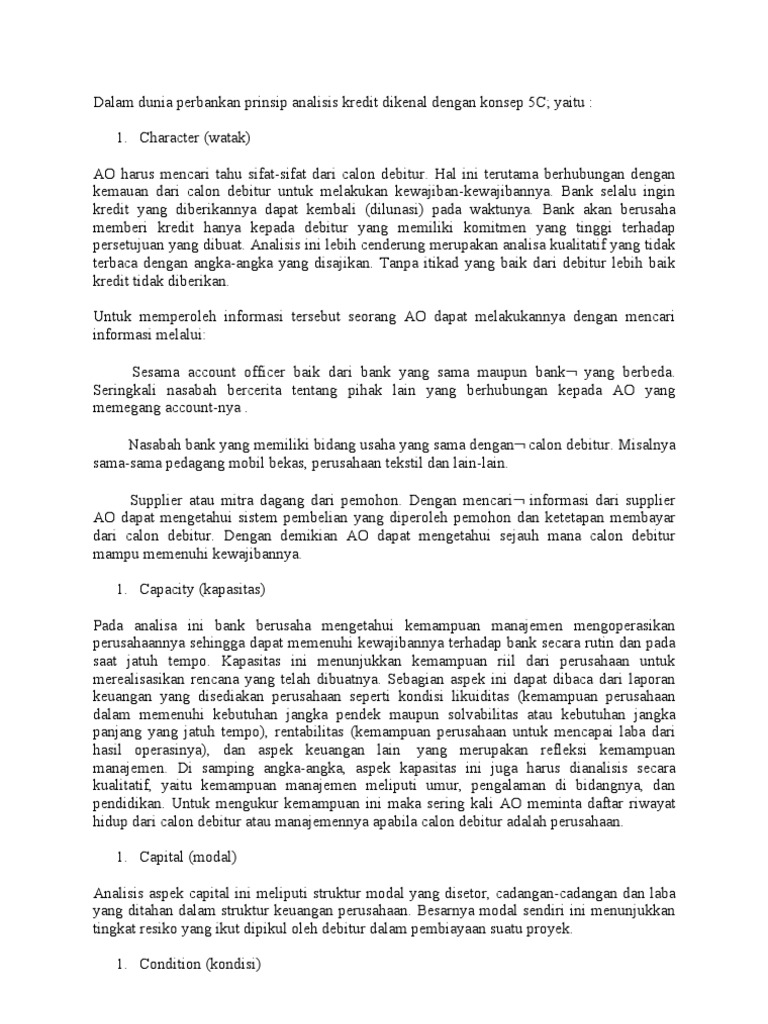 Dalam melakukan analisa kredit, bank harus memperhatikan prinsip analisa kredit yaitu analisa 7C, analisa 7P+3R dan analisa studi kelayakan. Analisa 7C dalam analisa kredit meliputi: Character: Informasi karakter calon debitur yang meliputi perilaku, kejujuran, pergaulan dan ketaatannya memenuhi pembayaran transaksi dapat diperoleh dengan ...
