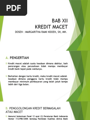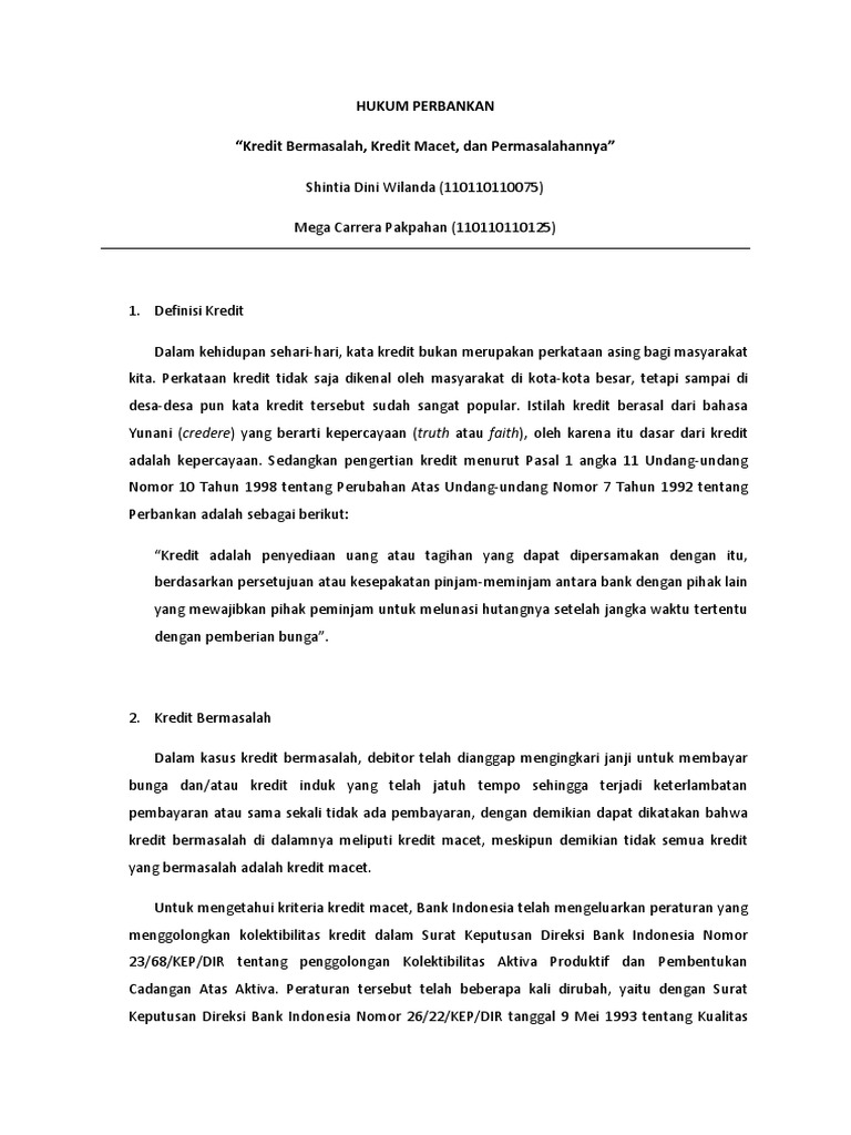 Pengertian Kredit Bermasalah Kredit bermasalah/macet atau problem loan adalah kredit yang mengalami kesulitan pelunasan akibat adanya Upaya dari pemerintah adalah dengan menerapkan UU No 5 Tahun 2011 dan Peraturan Menteri Keuangan Nomor: 17/PMK.01/2008 tentang jasa...