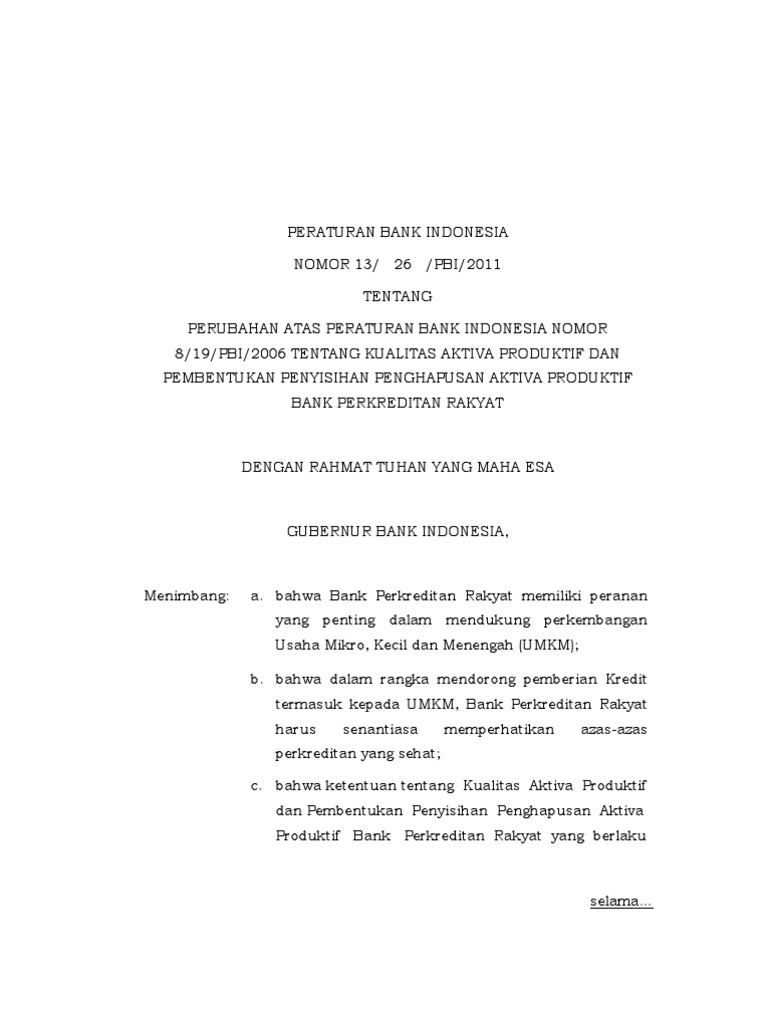 Peraturan bank indonesia nomor : 8/15/pbi/2006 tentang perlakuan khusus terhadap kredit bank bagi daerah-daerah BAB I PENDAHULUAN A. Latar Belakang Masalah Kondisi perekonomian yang terus berkembang saat ini menyebabkan sektor perbankan...