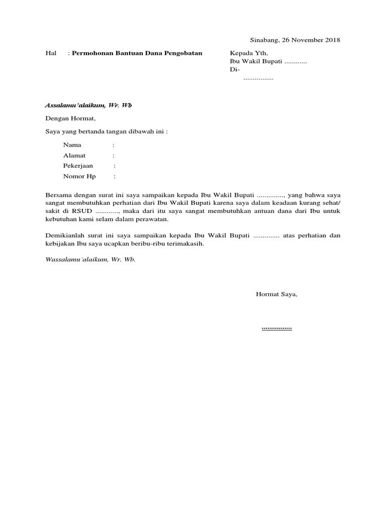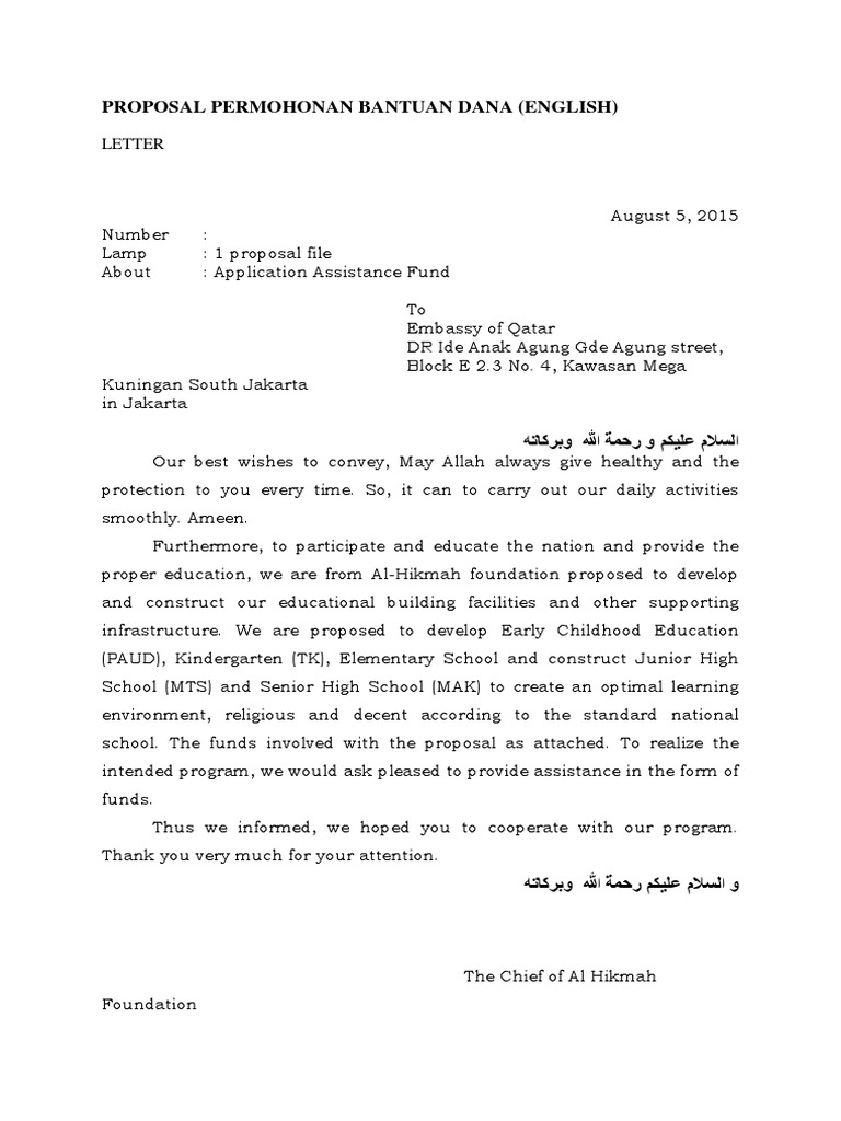 Surat permohonan bantuan dana. Surat permohonan bantuan adalah jenis surat memohon bantuan samada kewangan pendidikan dana perniagaan rumah dan biasiswa dari sesebuah organisasi agensi dan individu. Niat menyambut ramadhan niat menyambut ramadan 2019 niat menyambut ramadan niat ramadan satu bulan niat menyambut ramadan 2017 niat ramadan niat menyambut rama.. Ada banyak contoh surat permohonan bantuan dana yang diajukan, seperti bantuan dana untuk melaksanakan acara, mengikuti lomba dan penelitian. Surat permohonan bantuan dana merupakan salah satu jenis surat resmi yang cara penulisannya mengikuti kaidah bahasa Indonesia yang baku. Di dalamnya terdapat struktur meliputi pembukaan, isi dan penutup. Sep 08, 2019 · Surat permohonan dana adalah surat yang dibuat oleh perorangan maupun kelompok yang mana tujuannya untuk meminta atau permohonan bantuan berupa dana guna melakukan suatu kegiatan tertentu. Pastinya bila kita ingin mengadaka suatu acara atau event organisasi tertentu, bahkan untuk membangun suatu bangunan yang mana dipakai untuk umum, akan ...