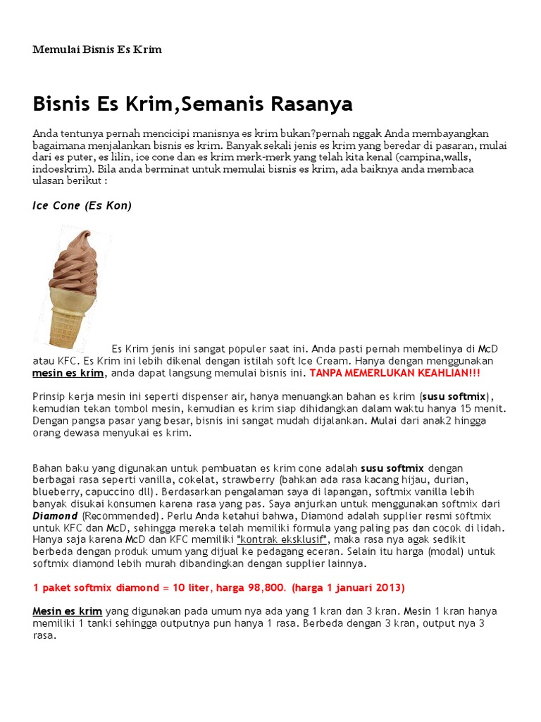 We would like to show you a description here but the site won’t allow us. Varian Es krim saat ini bukanlah ice cream cone saja namun kini banyak jenis ice ... Jangan pandang spele modal bisnis es krim, bisnis ini mulai dari modal ...