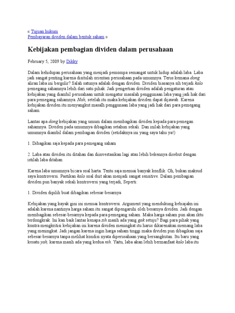 Mengumumkan dividen saham biasa 5% (100.000 lembar) nilai nominal Rp 20.000 dengan nilai pasar Rp 31.000 per lembar) (Debit) Dividen Saham = Rp 3.100.000.000 (Kredit) Dividen Saham yang Dibagikan = Rp 2.000.000.000 (Kredit) Agio Saham Biasa = Rp 1.100.000.000 1. Temukan dividen per lembar saham pada laporan laba rugi dan ikuti langkah-langkah untuk menghitung Earnings per share yang sudah saya tulis di artikel ini. 2. Bagi dividen per lembar saham dengan laba per saham untuk mendapatkan dividen payout. Angka yang Anda dapatkan dari perhitungan diatas adalah persentase laba yang menjadi dividen. Laba per saham (earnings per share/EPS) merupakan komponen penting dalam perhitungan price to earning ratio (PER).PER sering dijadikan indikator untuk menentukan harga saham murah atau mahal, bersama dengan PBV atau price to book value.. Menghitung laba per saham termasuk analisis fundamental dalam investasi saham. 1. Tetapkan dividen per saham. Metode di atas bukan satu-satunya cara untuk mengetahui rasio pembayaran dividen perusahaan. Rasio tersebut juga dapat diketahui dengan dua bagian lain dari informasi keuangan. Untuk metode alternatif ini, mulailah dengan mencari tahu nilai dividen per saham perusahaan (atau DPS).