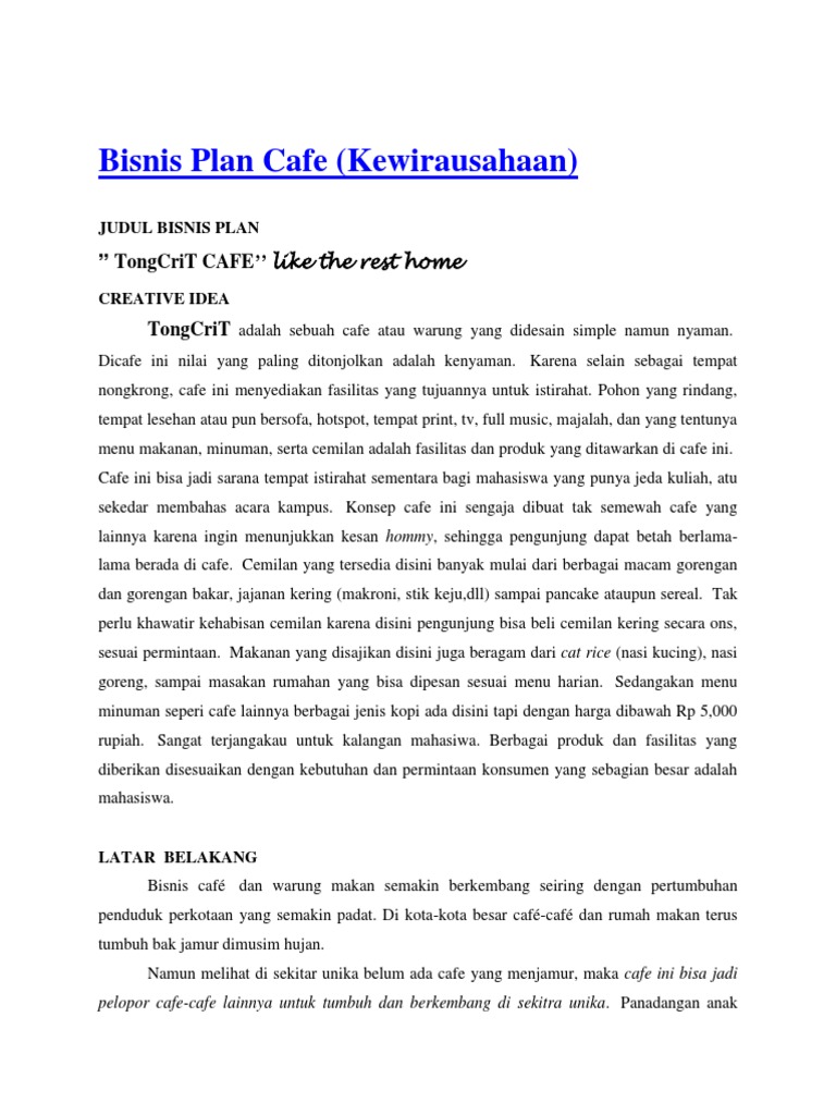 Makalah. Proposal Bisnis Plan Usaha Cafe. Latar belakang Kami menginspirasikan suatu konsep bisnis untuk rumah yang tidak ditempati agar dapat digunakan sebagai tempat usaha yang profitable. Contoh Proposal Usaha Bisnis Cafe.