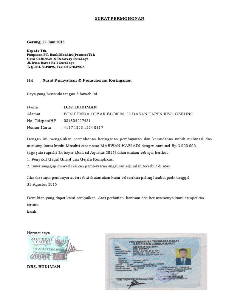 Surat Permohonan Keringanan Denda. 17 Contoh Surat Permohonan Dalam Berbagai Kasus Rekomended. Retribusi Daerah Permohonan Pengurangan Dan Keberatan. Mobil Ditarik Bukan Berarti Utang Otomatis Lunas. 4 Tips Melakukan Negosiasi Pembayaran Utang Kartu Kredit. Surat Keterangan Lunas Hutang. 17 Contoh Surat Permohonan Dalam Berbagai Kasus Rekomended. Gubernur Riau. Inilah pembahasan lengkap terkait contoh surat permohonan penghapusan bunga dan denda bank. Admin blog Bagi Contoh Surat 2019 juga mengumpulkan gambar-gambar lainnya terkait contoh surat permohonan penghapusan bunga dan denda bank dibawah ini. Pdf Problematika Pelaksanaan Pojk Nomor 45pojk032017. Admin blog Kumpulan Surat Penting juga mengumpulkan gambar-gambar lainnya terkait contoh surat permohonan pencairan deposito bank mandiri dibawah ini. Contoh Surat Kuasa Pengambilan Uang Di Bank Mandiri. 5 Sistem Bunga Perbankan Yang Mempengaruhi Besarnya Bunga Pencairan. Pt Bank Mandiri Persero Tbk Dan Entitas Anak. Simak! Contoh Surat Permohonan Keringanan Bunga Kredit Bank Kekinian. Tujuan dibuatnya surat tersebut adalah agar debitur mendapatkan keringanan bunga dan denda saat. Permohonan keringanan ini terpaksa saya ajukan dikarenakan saya mengalami kesulitan mengangsur tiap bulannya memohon agar bank mandiri menghapuskan bunga pinjaman.