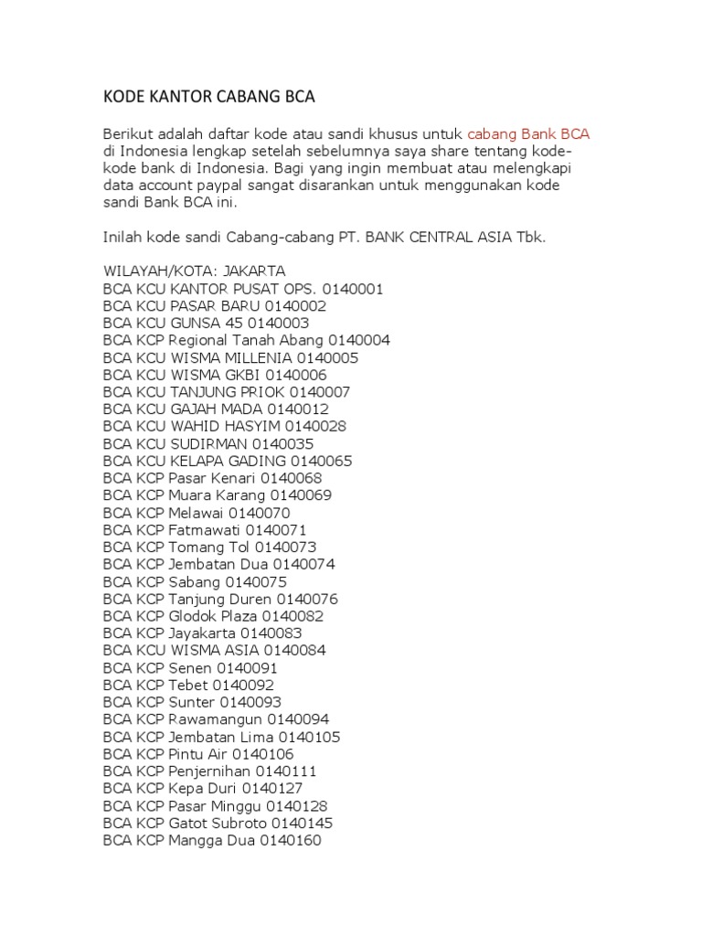 Biasanya kode bank BCA ini digunakan untuk akun Paypal saat mengambil saldo Paypal agar masuk ke rekening BCA. Perlu kalian ketahui bahwa kode BCA atau Branch Code BCA antar kota ataupun wilayah di Indonesia tidaklah sama. Jangan sampai kalian menggunakan kode BCA yang salah.