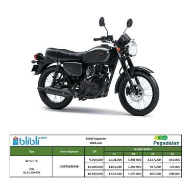 Kelebihan Kawasaki W175. Untuk kelas motor retro berkapasitas 177 cc, Kawasaki W175 cukup terjangkau dengan harga sekitar Rp30 jutaan. Keungulan lainnya dari Kawasaki W175 yaitu desain berkonsep retro yang klasik. Ini semakin sempurna dengan dilengkapi round headlights and mirrors ditambah tangki bensin yang tidak menyiku. Menggabungkan teknologi tinggi dengan warisan desain retro dalam satu paket, W175 membawa rasa hormat dari motor klasik menjadi pengalaman komuter yang efisien, ringan, namun kuat. Mengusung desain retro, Kawasaki W175 memang tak terbantahkan. Gayanya begitu klasik layaknya motor 70an. Rp 25.200.000 2020 Kawasaki w175 tahun 2020 bisa cash dan kredit bosquee Rawalumbu, Bekasi Kota Hari ini Rp 25.500.000 2020 ( dengan DP 1 juta punya w175 tahun 2020) cash credit Harga Kawasaki W175 di Jakarta Selatan mulai dari Rp 32,8 Juta untuk varian paling bawah Standard, sementara varian tertinggi Cafe dihargai Rp 35,1 Juta. Cek Promo terbaik hari ini 26 Januari 2022, dengan DP mulai dari Rp 8,8 Juta, Angsuran Rp 1,09 Juta (35x). Kunjungi Dealer Kawasaki di Jakarta Selatan untuk mendapatkan penawaran terbaik. Ada 3 varian Kawasaki W175 yang tersedia di Indonesia.