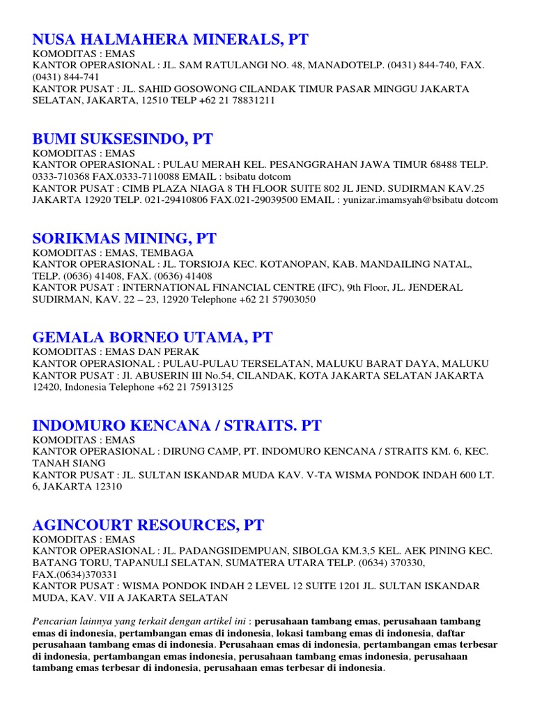 Gado Gado Meriah: Daftar Tambang Emas di Indonesia Daftar Tambang Emas di Indonesia 5. Adikarsa Surya Kencana, PT (Exploration) AddressJl. Raya Kutisari Indah No. 74 Surabaya Phones (62-31) 849-5683 Fax (62-31) 843-8512 6. Adil Petratama Solusindo, PT (Exploration) AddressJl. Hayam Wuruk No. 108 Jakarta Phones (62-21) 659-8822 Fax (62-21) 659-8821 7. Adimas Baturaja Cemerlang, PT (General Survey) Lokasi Tambang Emas | carbon davao murah Dari banyaknya penambang tersebut menciptakan Lokasi-lokasi pertambangan diberbagai wilayah indonesia, untuk itu saya akan memberikan daftar lokasi npertambangan emas di Indonesia. Seperti yang di ulas di Wikipedia.org Tentang lokasi tambang, Berikut dibawah ini adalah List/daftar nama tambang yang berada di Indonesia : 1. Daftar Perusahaan Produsen Emas Terbesar di Indonesia 28 Dec 2021 — 1. PT Antam (Persero) Tbk (UBPP Logam): 44,13 ton · 2. PT Freeport Indonesia: 28,01 ton · 3. PT Agincourt Resources: 12,17 ton · 4. PT Tambang ... Ini 5 Tambang Penghasil Emas Terbesar Indonesia Aug 13, 2021 · Tambang Emas Toka Tindung dimiliki oleh PT Archi Indonesia Tbk, melalui dua anak usahanya PT Meares Soputan Mining dan PT Tambang Tondano Nusajaya, berlokasi di Sulawesi Utara. Tambang emas ini telah beroperasi sejak 2009, dengan produksi emas pertama pada tahun 2011, dan memiliki cadangan emas sebesar 122 ton per akhir tahun 2020.