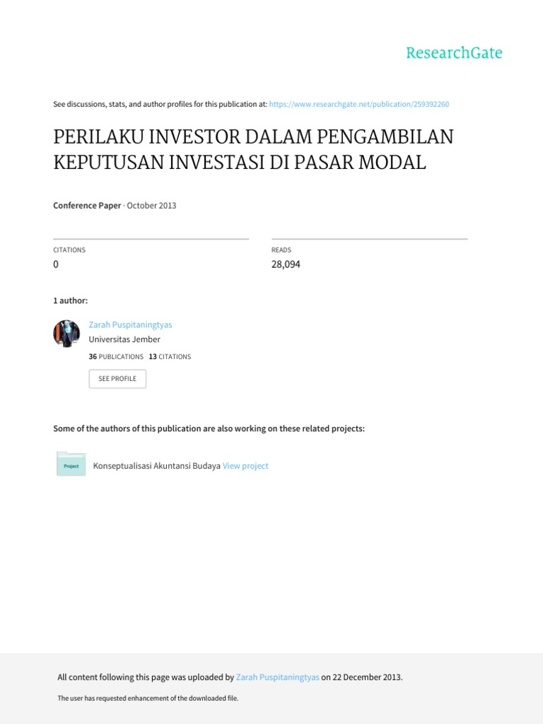 Pengaruh Emiten dan Perilaku Investor Terhadap Keputusan ... Analisis perilaku investor perspektif gender dalam pengambilan keputusan investasi di pasar modal, 6, 90-97. Saputri, M. E., & Pranata, T. R. (2014). Pengaruh Brand Image Terhadap Kesetiaan Pengguna Smartphone Iphone. PERILAKU INVESTOR DI PASAR MODAL INDONESIA - PDF Free Download PERILAKU INVESTOR DI PASAR MODAL INDONESIA Sumani. sumani@atmajaya.ac.id. Christine Winstinindah Sandroto christine.wins@atmajaya.ac.id. Indah Mula. Fakultas Ekonomi, Universitas Katolik Indonesia Atma Jaya Jakarta ABSTRACT The objective of this research is to classify thetype of individual investors in the Indonesia capital market. Perilaku Investor Di Pasar Modal Indonesia Perilaku Investor di Pasar Modal Indonesia - Sumani, Sandroto, Mula 213 Implikasi dari EMH adalah bahwa harga sekuritas telah mencerminkan semua informasi yang tersedia bagi investor di pasar dan harga sekuritas di pasar sudah "fair", sehingga tidak ada abnormal return bagi investor. Pada kenyataan adanya PDF Perilaku Investor Individu Dalam Pembuatan Keputusan ... Secara umum penelitian ini bertujuan untuk menginvestigasi pengaruh perilaku investor individu terhadap pembuatan keputusan investasi pasar modal. Secara khusus, tujuan penelitian ini adalah untuk menginvestigasi pengaruh efek disposisi dengan perlakukan informasi akuntansi terhadap keputusan investasi di pasar modal.