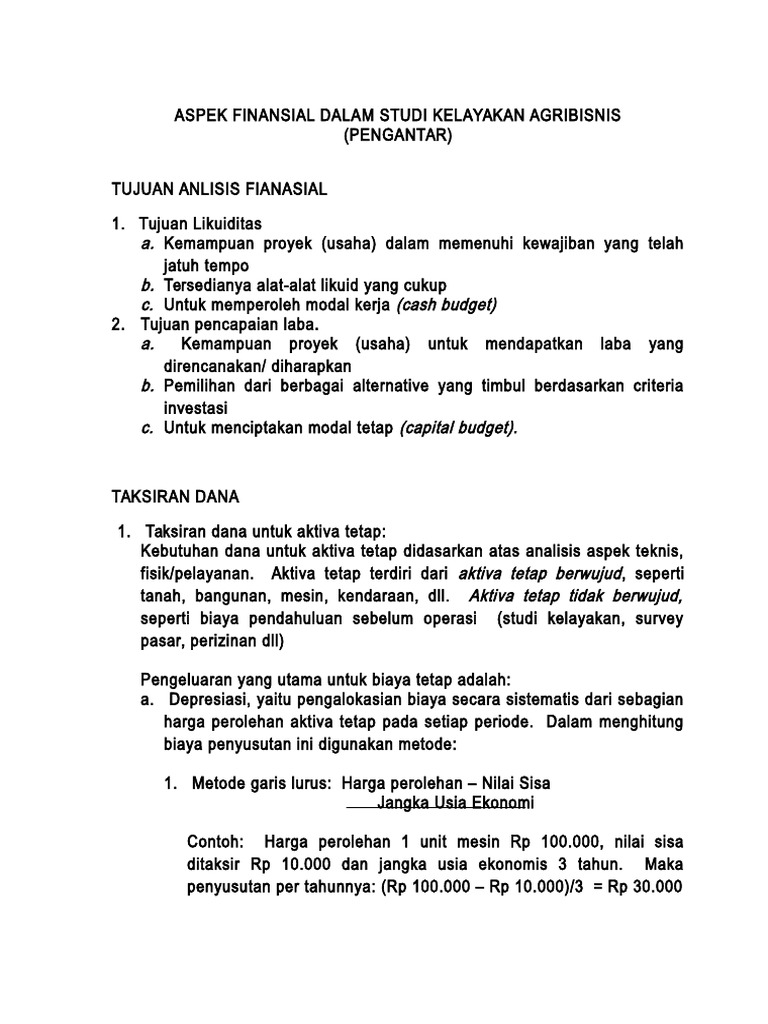 Aspek-Aspek Studi Kelayakan Bisnis Dan Contoh Lengkapnya ... Adapun aspek-aspek studi kelayakan bisnis mendasar yang biasanya menjadi bahan penelitian dalam studi ini adalah: 1. Aspek Hukum Dan Legalitas. (Sumber : Ikut.org) Aspek ini berkaitan pada segala hal mengenai kelengkapan administrasi yang menunjukan legalitas rancangan bisnis yang hendak dilakukan perusahaan. (DOC) Aspek Finansial pada Studi kelayakan bisnis | Taufiq ... Maksud dan Tujuan Adapun tujuan dari penyusunan makalah ini adalh sebagi berikut: Mengetahui bahsan dalam aspek finansial. Mengetahui cara penganalisisan laporan keuangan dalam studi kelayakan bisnis. f BAB II ISI A. Sistematika Aspek Finasial/Keuangan Dalam ptoses mengkaji kelayakan bisnis atau proyek dari aspek finansial, pendekatan ...