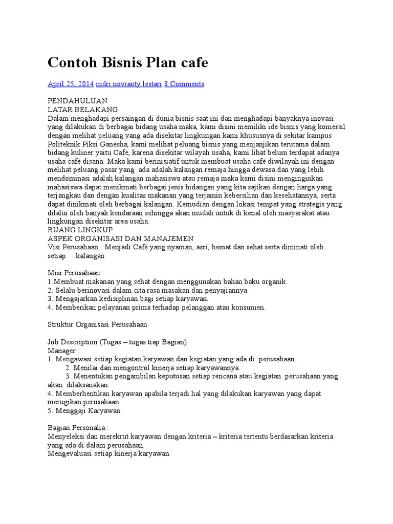 Contoh Proposal Bisnis Plan Jasa Pengetikan - Contoh ... Contoh bisnis plan cafe bagi setiap orang yang hendak menjalakan bisnis cafe tentu membutuhkan contoh proposal bisnis plan cafe. Begitupula anda bisa mendownload secara gratis berbagai macam contoh proposal bisnis yang unik dan menarik dengan modal seperti 50 juta ataupun modal minim untuk usaha kecil menengah ukm. PDF BAB 1 PENDAHULUAN 1.1. Latar Belakang Masalah Perkembangan bisnis cafe di Indonesia saat ini sedang berkembang sangat pesat. Hal ini dapat dilihat Banyaknya cafe yang bermunculan dikarenakan cafe sudah menjadi lifestyle bagi kebanyakan orang di jaman sekarang, dengan menyediakan tempat dengan desain interior yang menarik serta menawarkan suasana yang nyaman dan menyenangkan. Serta Bisnis Plan Contoh Versi Pdf (Bisa Didownload) - Muamala Net bisnis plan pdf contoh. Dalam bisnis plan tersebut juga dipaparkan kompetitor yang sudah terlebih dahulu ada di pasaran. Mereka tidak bisa dipandang sebelah mata. Selain itu yang paling penting juga, proyeksi keuangan bisnis plan cafe cokelat ini menunjukan keuntungan. Bisnis minuman cokelat cukup menguntungkan. Contoh Bisnis Plan untuk Cafe, Jasa, Makanan & Minuman ... Contoh Bisnis Plan. Berikut beberapa contoh Bisnis Plan untuk jasa, franchise makanan dan minuman, dan cafe secara lengkap serta sederhana dengan format DOC dan PDF. Bisnis Plan adalah dokumen tertulis yang menjelaskan secara terperinci bagaimana suatu bisnis baru akan mencapai tujuannya. Contoh Bisnis Plan menjabarkan rencana tertulis dari ...