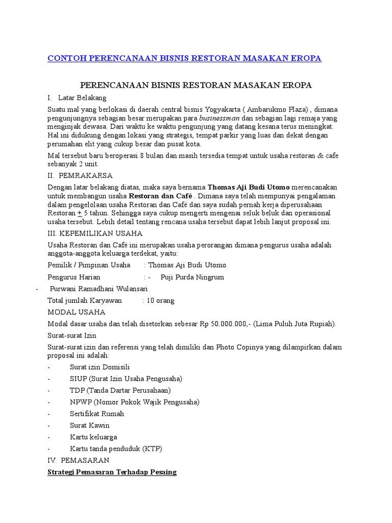 Contoh rencana bisnis makanan. Contoh Makalah Business Plan Pisang Karamel (Proposal Usaha) Adapun modal awal bisnis pisang karamel sebagai berikut: Jadi total untuk modal awal kebutuhan jangka panjang dan jangka pendek adalah Rp. 4.902.000 + Rp. 178.000 = Rp. 5.080.000. C. Rencana Pendapatan Adapun gambaran pendapatan yang akan kami terima adalah sebagai berikut. Untuk target penjualan pisang coklat 100 pcs per hari. Penjelasan Dan Cara Menyusun Bisnis Plan Makanan Walaupun bisnis makanan, sangatlah penting Anda menuliskan rencana sedetail mungkin agar dapat mengukur perkembangan bisnis Anda secara berkala. Tahapan Dalam Membuat Bisnis Plan Makanan Sebelum menuliskan poin-poin dalam perencanaan usaha kuliner Anda, berikut ini adalah lima langkah tepat yang harus Anda lakukan. 5+ Contoh Proposal Bisnis Plan Untuk Bisnis Makanan - EvanAzka Diatas tadi sudah kami berikan beberapa daftar contoh untuk sebuah rencana bisnis yang siap untuk direalisasikan. Isi dari proposal bisnis yang satu ini meliputi sebuah usaha properti atau Bisnis Plan Agrovillage, rencana sebuah bisnis ekspor atau Indochemical Agrotech, dan juga sebuah proposal usaha yang kreatif Bamboo Speaker. Contoh Proposal Usaha Makanan yang Baik dan Benar ... 1. Proposal Bisnis Proposal bisnis dikaitkan dengan dunia usaha atau bisnis, baik perseorangan atau kelompok. Contoh: Proposal pengajuan iklan, sponsorship, dan pendirian usaha makanan atau usaha lain. 2. Proposal Kegiatan Proposal ini dibuat untuk mengajukan rencana kegiatan, baik bersifat individu atau kelompok.