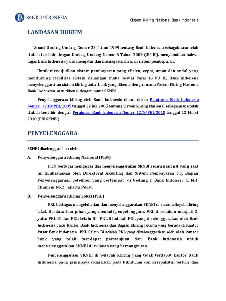 PDF Sistem kliring nasional bank indonesia 2. SKNBI adalah sistem kliring Bank Indonesia yang meliputi kliring debet dan kliring kredit yang penyelesaian akhirnya dilakukan secara nasional. KARATERISTIK Penyelenggara. SKNBI diselenggarakan oleh