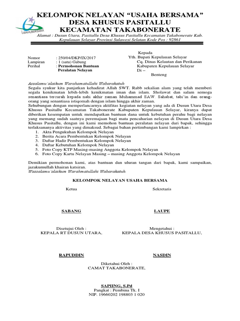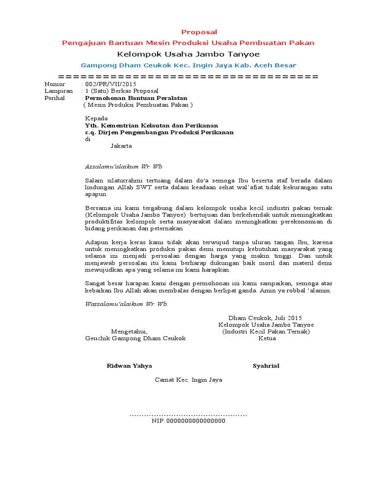 Contoh Proposal Permohonan Bantuan Benih dan Pakan Udang ... Dalam contoh proposal ini Saya akan membagikan salah satu contoh permohonan bantuan Benih dan Pakan untuk udang Vannamei. Permohonan Bantuan ini dilakukan oleh kelompok budidaya ikan di daerah. Permohonan bantuan ini terlebih dahulu diajukan melalui Kepala Dinas Kelautan dan Perikanan & Ketahanan Pangan di Masing - masing Wilayah. Contoh Proposal Bantuan Alat Tangkap Ikan Dalam menentukan keberhasilan usaha penangkapan ikan pada dasarnya tergantung pada jenis alat tangkap yang disesuaikan dengan musim yang terjadi. Jika alat tangkap yang memadai, maka nelayan akan dapat meningkatkan hasil tangkapnya dan hal ini tentu akan menjadi peningkatan ekonomi bagi nelayan tersebut. 2. RENCANA ANGGARAN BIAYA. NO. JENIS ALAT.