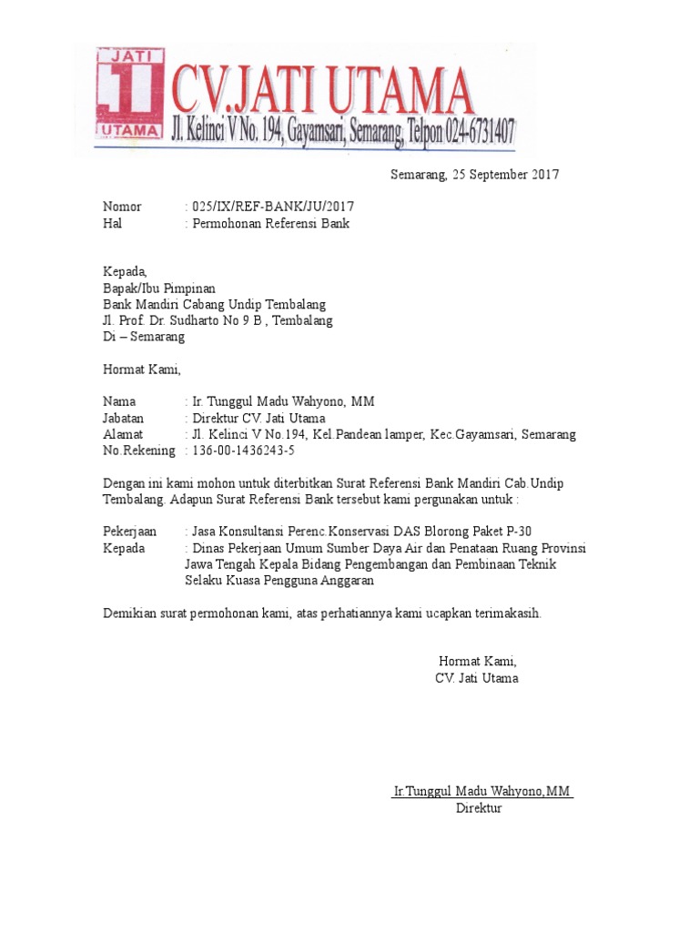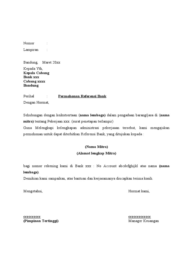 Surat Permohonan Referensi Bank - MasNurul Surat permohonan referensi bank.Yusuf ardia putra direktur utama. Documents similar to surat permohonan referensi bank mandiri ac. Demikian surat permohonan pembuatan referensi bank ini kami buat atas perhatian dan kerjasamanya kami ucapkan terimakasih.