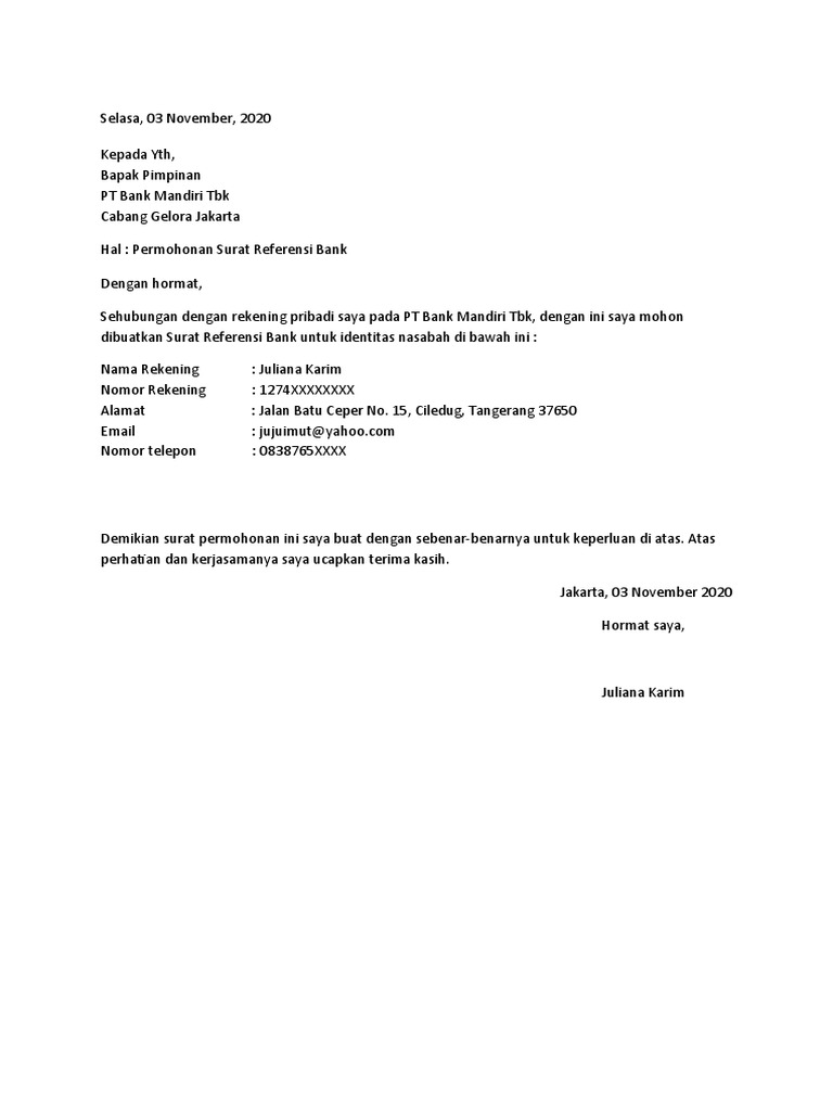 14+ Contoh Surat Permohonan Pembukaan Rekening Giro ... 14+ Contoh Surat Permohonan Pembukaan Rekening Giro - Lezgetreal. Februari 23, 2022. Contoh Surat Permohonan Pembukaan Rekening Giro - Tentu kamu sudah mengetahui rekening giro merupakan salah satu produk perbankan yang sangat penting, khususnya bagi instansi, baik itu sekolah, pemerintah, atau perusahaan. Surat Permohonan Referensi Bank Mandiri AC | PDF Perihal : Permohonan Referensi Bank. Kepada YTH, Kepala Cabang Bank Mandiri (Persero) Tbk Kantor Cabang Jakarta RS. Pelni Jl. Aipda KS Tubun 92-94 Jakarta 11410. Dengan Hormat. Sehubungan dengan rekening perusahaan kami pada PT. Bank Mandiri (Persero) Tbk, dengan ini kami mohon dibuatkan Referensi Bank untuk nomor rekening di bawah ini : Surat Permohonan Referensi Bank - MasNurul Surat permohonan referensi bank.Yusuf ardia putra direktur utama. Documents similar to surat permohonan referensi bank mandiri ac. Demikian surat permohonan pembuatan referensi bank ini kami buat atas perhatian dan kerjasamanya kami ucapkan terimakasih.