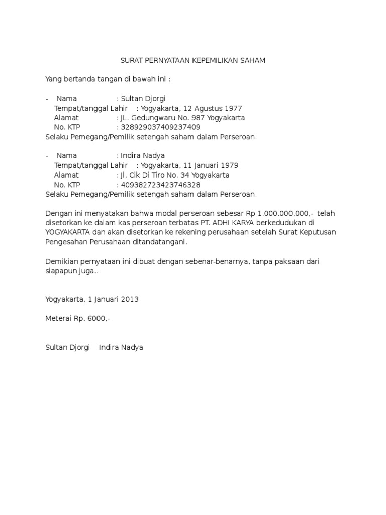 contoh surat pernyataan kepemilikan saham - VDOKUMEN Dec 14, 2015 · Contoh Surat Pernyataan Kepemilikan Saham. SURAT PERNYATAAN KEPEMILIKAN SAHAM. Yang bertanda tangan di bawah ini : - Nama : Sultan Djorgi. Tempat/tanggal Lahir : Yogyakarta, 12 Agustus 1977. Alamat : JL. Gedungwaru No. 987 Yogyakarta. No. KTP : 328929037409237409. Selaku Pemegang/Pemilik setengah saham dalam Perseroan.