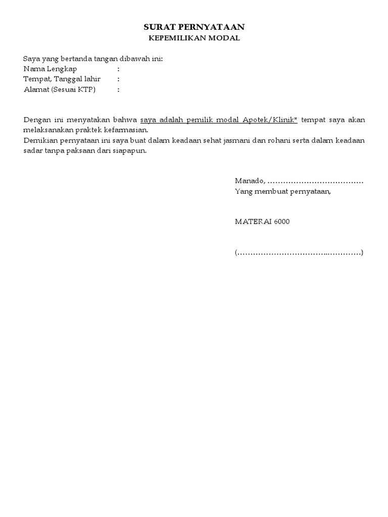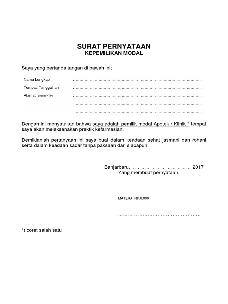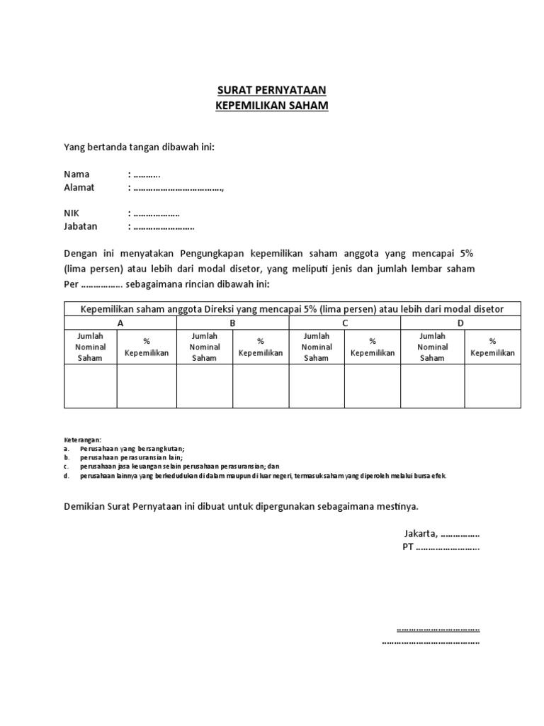 PDF CHECKLIST DOKUMEN PERMOHONAN PERUBAHAN KEPEMILIKAN (Revisi ... sumber dana Pemegang Saham ini misalnya rekening koran 6 (enam) bulan terakhir yang menunjukkan Pemegang Saham baru memiliki dana yang mencukupi untuk menyetorkan modal. e. Surat pernyataan bermaterai dari yang bersangkutan. 2. Surat pernyataan paling sedikit menyatakan bahwa: 1. Setoran modal atau dana pembelian saham tidak 👍 Download Contoh Surat Pernyataan Kepemilikan Saham Doc ... Download Contoh Surat Pernyataan Kepemilikan Saham Doc Document. Download format surat lain: Contoh Lembar Saham Surat Saham Format 810 x 613. Pengertian Saham Secara Umum Pengertian Org Format 257 x 355 pixel. Download Laporan Pembayaran Saham Mini Market Per Pebruari Format 960 x 720 pixel. Surat Tanda Kepemilikan - Kompasiana.com May 16, 2017 · Saham merupakan surat berharga keuangan yang diterbitkan oleh suatu perusahaan saham. patungan sebagai suatu alat untuk meningkatkan modal jangka panjang. Para pembeli saham. membayarkan uang pada perusahaan dan mereka menerima sebuah sertifikat saham sebagai. tanda bukti kepemilikan mereka atas saham-saham dan kepemilikan mereka dicatat dalam. Pernyataan Susunan Kepemilikan Saham - Scribd TOTAL *) uraikan sampai dengan 2 tingkat kepemilikan saham, apabila bukan kepemilikan perseorangan. Pernyataan ini dibuat dengan sebenar-benarnya dan ditandatangani diatas kertas bermaterai serta dapat dipertanggungjawabkan secara hukum.