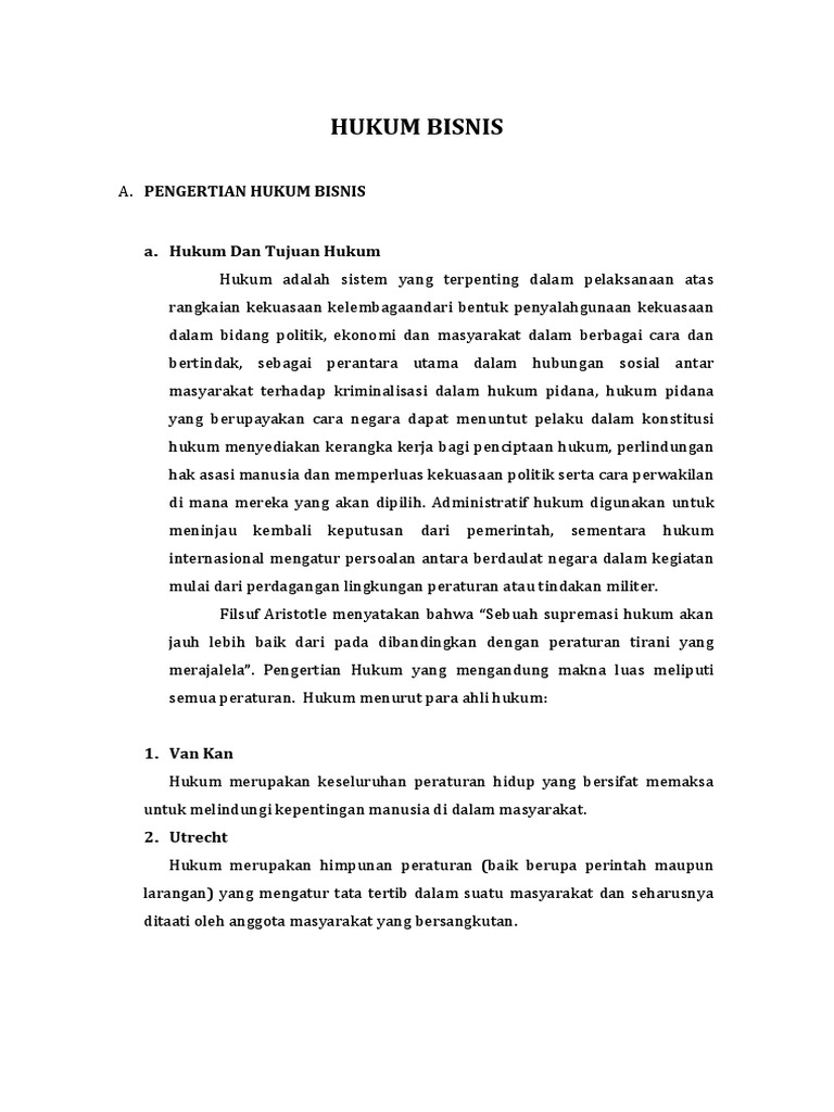 (DOC) Makalah Pengantar Hukum Bisnis | Iin Iryani ... keanekaragaman kerjasama bisnis ini tentu saja menghasilkan masalah tantangan baru, karena hukum harus siap untuk dapat mengantisipasi perkembangna yang muncul. 2.1.3 definisi hukum bisnis hukum diciptakan untuk menjamin keadilan dan kepastian, serta diharapkan dapat berperan untuk menjamin ketentraman warga masyarakat dalam tujuan- …