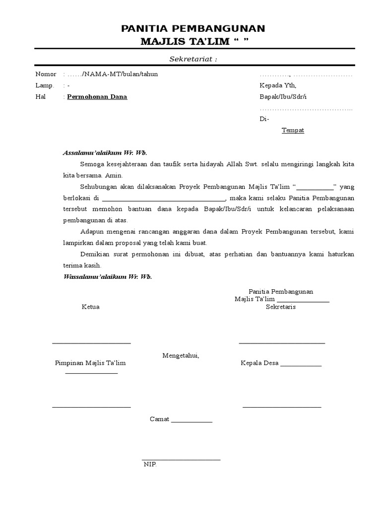 Contoh Proposal Bantuan Dana Pembangunan Majlis Ta'lim ... Adapun mengenai rancangan anggaran dana dalam Proyek Pembangunan tersebut, kami lampirkan dalam proposal yang telah kami buat. Demikian surat permohonan ini dibuat, atas perhatian dan bantuannya kami haturkan terima kasih.
