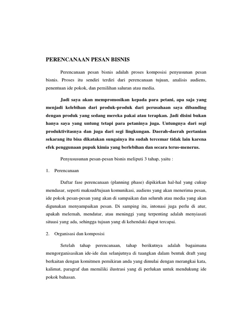 (PDF) PERENCANAAN PESAN-PESAN BISNIS | Hairum Rijal ... PERENCANAAN PESAN-PESAN BISNIS Makalah Untuk memenuhi tugas individu Komunikasi Bisnis Oleh Hairum Rijal 031075333 Jurusan Manajemen Fakultas Ekonomi & Bisnis UPBJJ-Universitas Terbuka Kendari 2018 f PERENCANAAN PESAN-PESAN BISNIS A. Pemahaman Proses Komposisi 1. Perencanaan Dalam fase perencanaan, dipikirkan hal-hal cukup mendasar, seperti ...