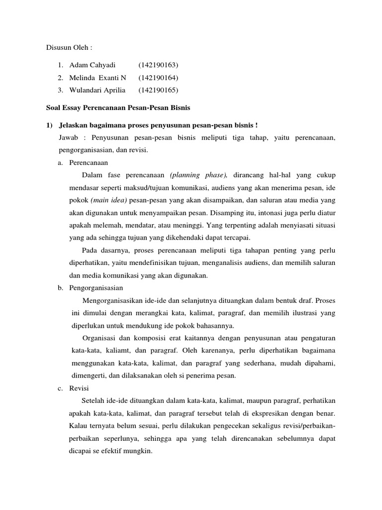 [Soal dan Jawaban] Perencanaan Pesan Bisnis - Gedung Ge 1. Jelaskan proses penyusunan pesan bisnis ! Jawab : Proses penyusunan pesan bisnis pada umumnya terdiri atas 3 tahap sederhana : 1. Perencanaan pesan : Dalam tahap ini, ditentukan hal-hal yang mendasar dari suatu pesan yang akan dikomunikasikan.