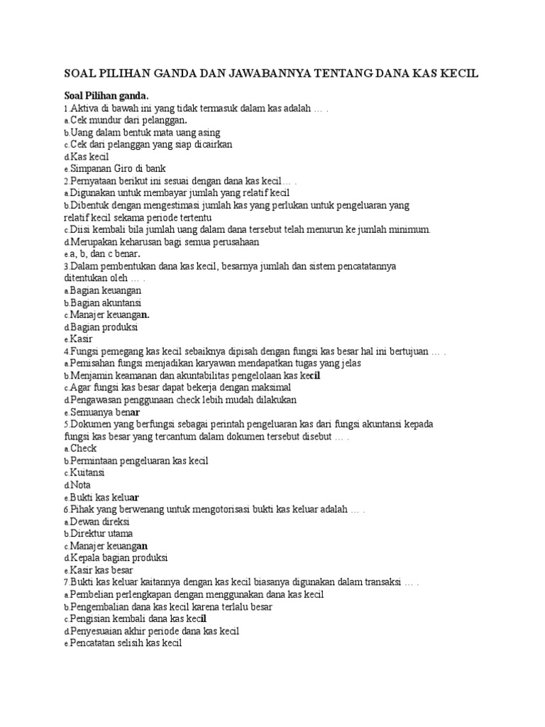Soal Pilihan Ganda Dan Jawabannya Tentang Dana Kas Kecil ... SOAL PILIHAN GANDA DAN JAWABANNYA TENTANG DANA KAS KECIL Soal Pilihan ganda. 1.Aktiva di bawah ini yang tidak termasuk dalam kas adalah … . a.Cek mundur dari pelanggan. b.Uang dalam bentuk mata uang asing c.Cek dari pelanggan yang siap dicairkan d.Kas kecil e.Simpanan Giro di bank 2.Pernyataan berikut ini sesuai dengan dana kas kecil… . a.Digunakan untuk membayar jumlah yang relatif kecil ...