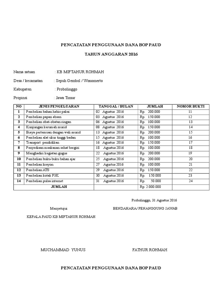 Contoh Format Laporan Penggunaan Dana BOP PAUD - Berkas Edukasi May 08, 2017 · Format Laporan Penggunaan Dana BOP (Bantuan Operasional Penyelenggaraan) PAUD. Download File Format .docx Microsoft Word. Seperti kita ketahui bahwa Penggunaan dana BOP PAUD di Satuan PAUD atau Lembaga harus didasarkan pada Rencana Kerja Anggaran (RKA) PAUD yang telah disusun dengan memperhatikan komponen kegiatan-kegiatan seperti Kegiatan ...