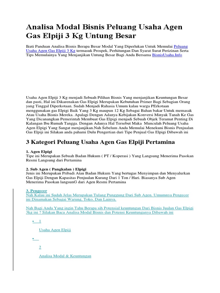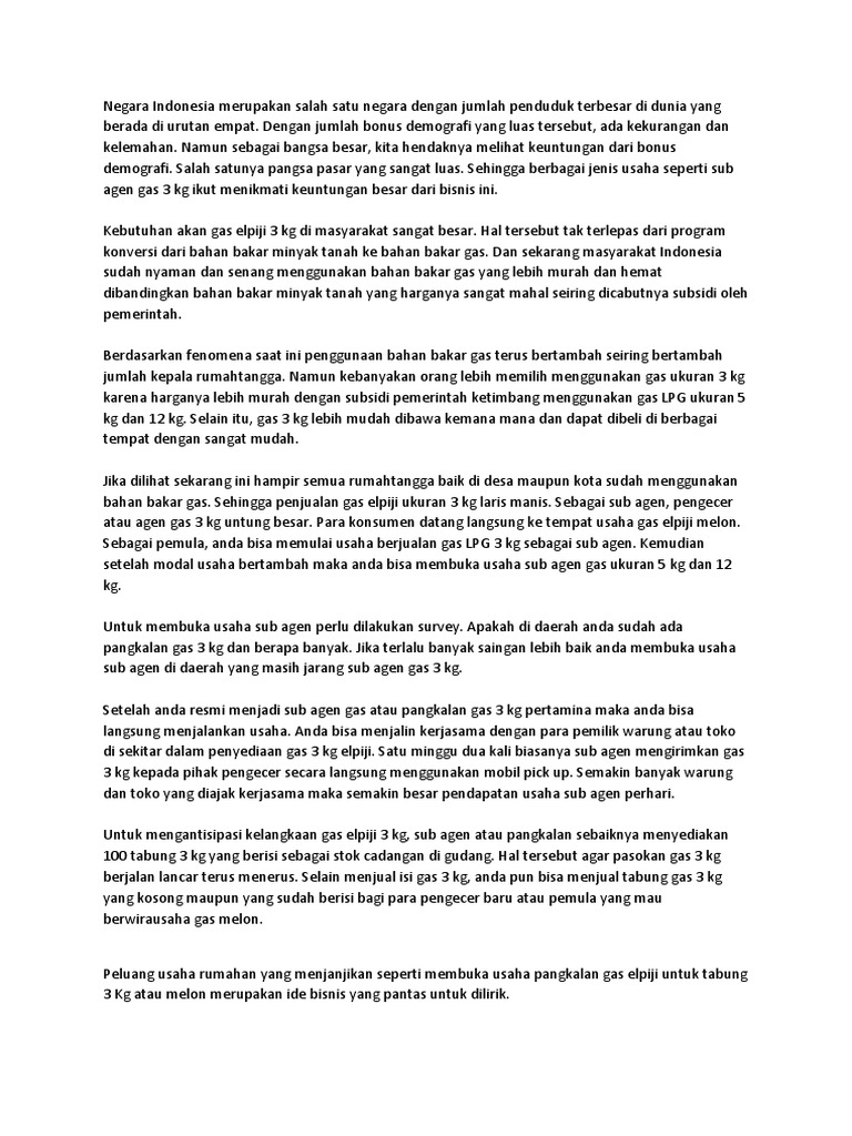 3 Peluang Bisnis Gas Elpiji 3 Kg Yang Bisa Geluti ... Permintaan gas elpiji 3 kg memang terus meningkat setiap tahunnya, sehingga tak jarang permintaan konsumen akan gas elpiji selalu membludak. Oleh sebab itulah, jika Anda ingin menjadi pebisnis sukses, sebaiknya manfaatkan peluang bisnis gas elpiji ini dengan cara menjadi agennya. Syarat Menjadi Agen Gas Elpiji 3 Kg, Cocok Jadi Bisnis Nah, itulah syarat menjadi agen gas elpiji 3 kg yang harus dipenuhi bila Ayah tertarik menjadikannya bisnis. Meski rumit, semua persyaratan tersebut tentu sepadan dengan keuntungan yang Ayah dapatkan. Namun, sama seperti bisnis lainnya, Ayah perlu mempertimbangkannya dengan matang sebelum benar-benar menjalankannya. Cara Membuka Usaha Bisnis Gas LPG 3 Kg, 5 Kg, dan 12 Kg ... Dalam menekuni bisnis jualan gas elpiji pertamina baik ukuran 3 kg, 5 kg dan 12 kilogram kerapkali mengalami yang namanya hambatan dan rintangan. Berikut ini salah satu kendala dan hambatan yang seringkali ditemui dalam bisnis jualan gas LPG pertamina adalah kelangkaan gas elpiji.