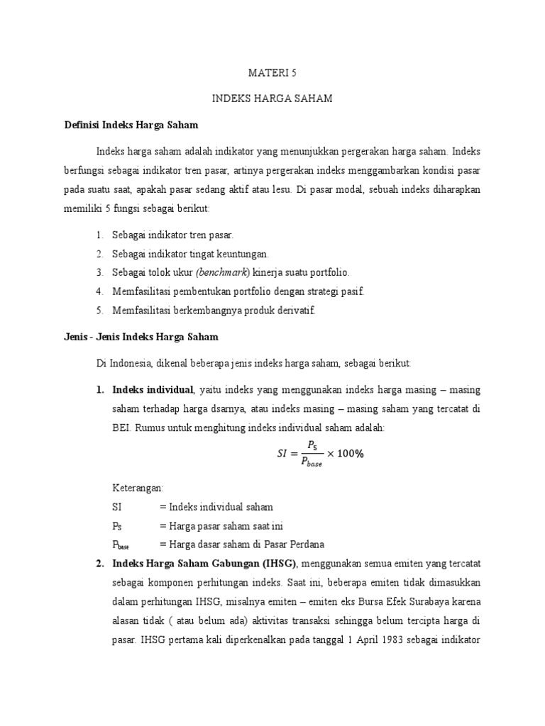 (PDF) Dinamika Bursa Saham Asing Dan Makroekonomi Terhadap ... Kurs ber- ini adalah Indeks Harga Saham Gabungan pengaruh negatif dan signifikan secara (IHSG), Nilai Tukar Rupiah terhadap Dolar statistik terhadap IHSG sedangkan suku (Kurs) dan . Hasil bunga SBI dan inflasi juga berpengaruh penelitian menunjukkan secara empiris negatif tetapi tidak signifikan secara statis- bahwa uji akar unit ( ) dengan tik ... Mengenal Jenis-jenis Indeks Saham - Investor Daily Indeks saham adalah ukuran statistik perubahan gerak harga dari kumpulan saham yang dipilih berdasarkan kriteria tertentu dan digunakan sebagai sarana tujuan investasi. Banyaknya saham yang diterbitkan oleh banyak perusahaan, maka dibuatlah indeks saham ini untuk memantau kinerja sebuah bursa secara umum. Mengapa indeks saham ini penting? IHSG Adalah: Pengertian, Fungsi, dan Beberapa Istilah di ... Salah satunya adalah IHSG atau Indeks Harga Saham Gabungan. IHSG adalah suatu acuan yang sering dilakukan oleh para investor dalam menentukan kapan mereka harus membeli dan juga menjual instrumen investasi. Nah, untuk Anda yang penasaran tentang pengertian IHSG beserta fungsi dan istilah di dalamnya. Berikut ini kami akan jabarkan seluruh hal ... Abdul Hafidz Firdaus @Abhaf: Makalah Indeks Harga Saham investasi khususnya saham di pasar modal. Jadi indeks harga saham itu adalah suatu peta grafik yang mana menggambarkan tetang perjalan/perubahan-perubahan kondisi sebuah pasar modal dari waktu-waktu. Indeks harga saham ini berfungunsi sebagai indikator trend pasar. Dimana indeks harga