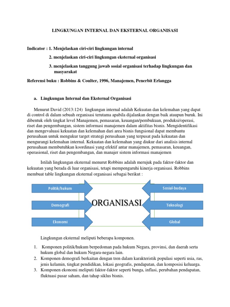 Lingkungan Organisasi : Penjelasan Lingkungan Internal dan ... Lingkungan organisasi adalah segala aktifitas atau komponen yang mempengaruhi input, output, eksistensi, pendapatan, dan keberlangsungan organisasi baik pengaruh dari dalam organisasi (internal) atau pun pengaruh dari luar organisasi (eksternal. Sering kali faktor ini menjadi hambatan bagi proses keberlanjutannya organisasi.