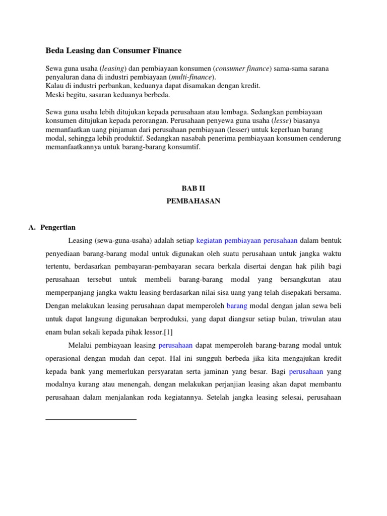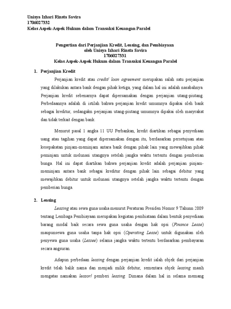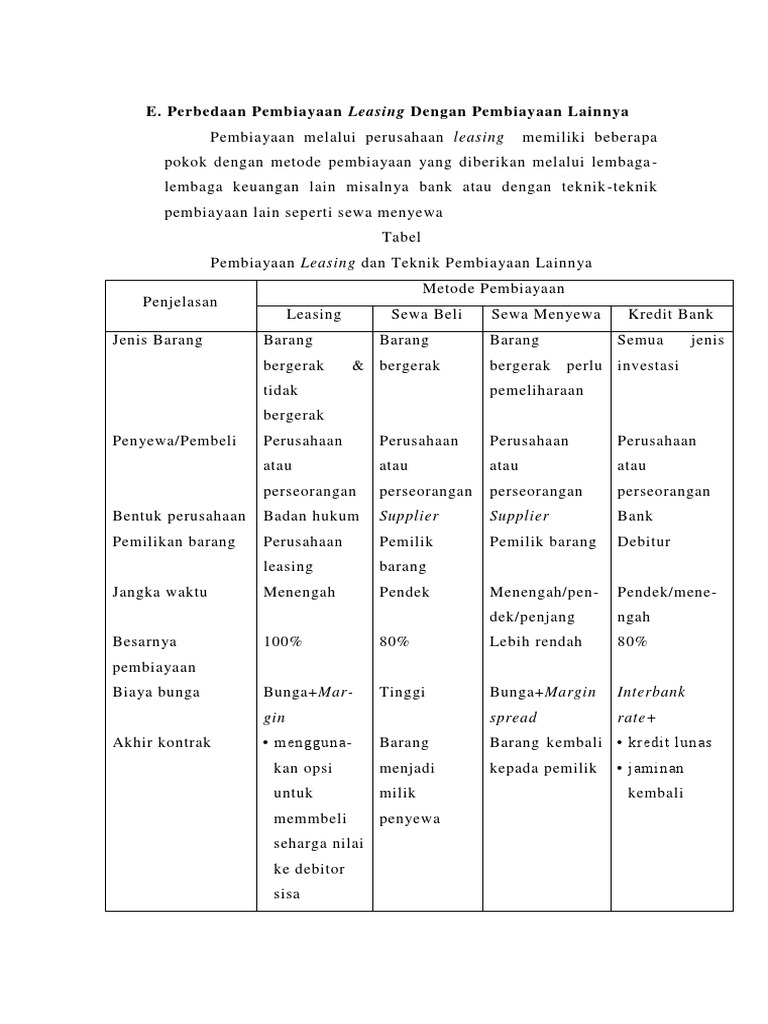 Perbedaan leasing dan kredit. Perbedaan leasing konvensional dengan leasing... Berdasarkan syarat dan ciri leasing di atas, maka praktek jual beli motor yang dikatakan dengan sistem leasing, namun karena tidak ada hak opsi dari pemakai barang, maka hal tersebut sebenarnya tidak bisa Asyhadie menyebut jual beli kredit sepeda motor ini sebagai pembiayaan konsumen. Perbedaan Leasing dan Kredit Kendaraan / Mesin Fidusia LEGAL OPINION. Question: Sebetulnya apakah leasor selaku lembaga pembiayaan berupa leasing kendaraan bermotor wajib untuk mengikat sempurna surat kuasa mengikat fidusia untuk menjadi akta yang kemudian didaftarkan pada Kementerian Hukum agar dituangkan dalam sertifikat fidusia? Modul Leasing | PDF Perbedaan Leasing dan Kredit Kriteria Objek barang Pemilik Barang Penjaminan resiko Jaminan Wanprestasi Lessor Resiko pada financial barang Barang modal Tidak ada Barang bergerak pengmbalian Ada pengembalian kelebihan harga barang kelebihan harga barang tetap / barang... Kenali Perbedaan Leasing dan Kredit, Agar Tidak... | Kredit Pintar Demikianlah informasi terkait perbedaan leasing dan kredit, sehingga Sobat Pintar tidak lagi salah dalam memahami maknanya. Jika membutuhkan pinjaman dana tunai dengan proses cepat, Sobat Pintar bisa mengakses melalui aplikasi Kredit Pintar. Ajukan sekarang juga untuk mendapatkan...