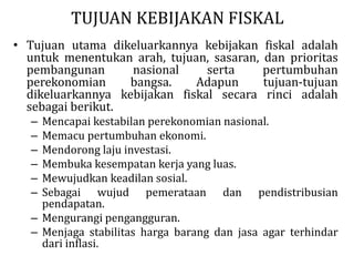 Kebijakan Fiskal: Pengertian, Tujuan, Instrumen dan Jenisnya Tujuan utama dikeluarkannya kebijakan fiskal adalah untuk menentukan arah, tujuan, sasaran dan prioritas pembangunan nasional serta pertumbuhan perekonomian bangsa. Tapi tunggu dulu, nggak cuma itu, karena ternyata ada beberapa tujuan kebijakan fiskal yakni