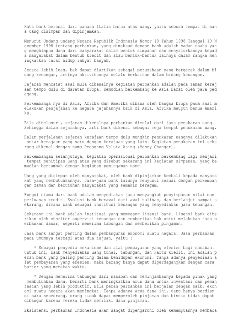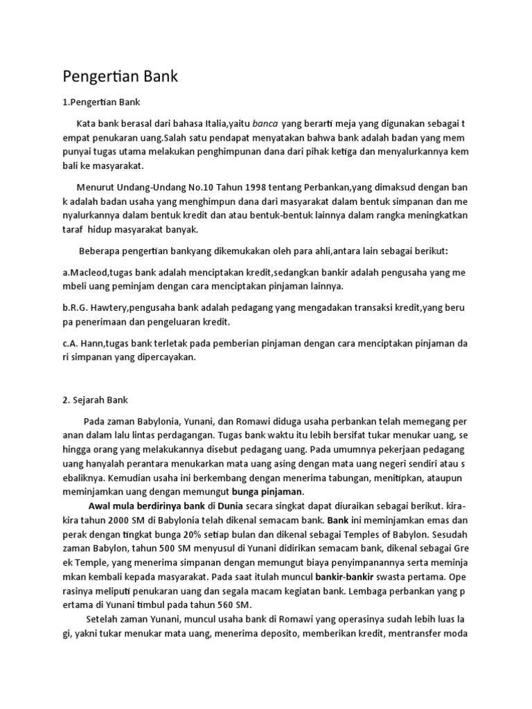 Soal Teks Diskusi Kelas 9 dan Kunci Jawaban Soal Teks Diskusi Kelas 9 dan Kunci Jawaban. Pembicaraan saling adu argumentasi, pelaku bisa antarpribadi atau antarkelompok yang bertujuan untuk mencapai kemenangan bagi salah satu pihak yang berdebat adalah pengertian dari diskusi. A. debat. Makalah tentang riba, asuransi, bunga bank Kata bank berasal dari bahasa italia" Banque" yang artinya bangku. Atau " Banca" yang artinya tempat penukaran uang. Menurut istilah Bank adalah sebuah lembaga yang menjadi media keuangan, umumnya bank didirikan dengan kewenangan untuk menerima simpanan uang,meminjamkan uang, dan memertibkan promis atau dikenel sebagai banknote. Etimologi Kata bank berasal dari bahasa Italia banque atau ... Etimologi Kata bank berasal dari bahasa Italia banque atau Italia banca yang berarti bangku. Para bankir Florence pada masa Renaissans melakukan transaksi mereka dengan duduk di belakang meja penukaran uang, berbeda dengan pekerjaan kebanyakan orang yang tidak memungkinkan mereka untuk duduk sambil bekerja. Pengertian Menurut UU RI No 10 Tahun 1998 tanggal 10 November 1998 tentang perbankan ...