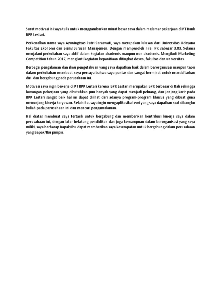 Motivasi Melamar Kerja di Bank Indonesia Terbaru 2021 ... Berkerja di Bank merupakan kesempatan emas untuk siap mengembangkan karir selama beberapa tahun ke depan. Kami pikir Bank adalah tempat yang tepat untuk mencoba berbagai hal dalam masa depan yang cerah. Contoh harapan apabila diterima kerja merupakan cara semangat untuk mewujudkan hasil yang maksimal secara etimologis.