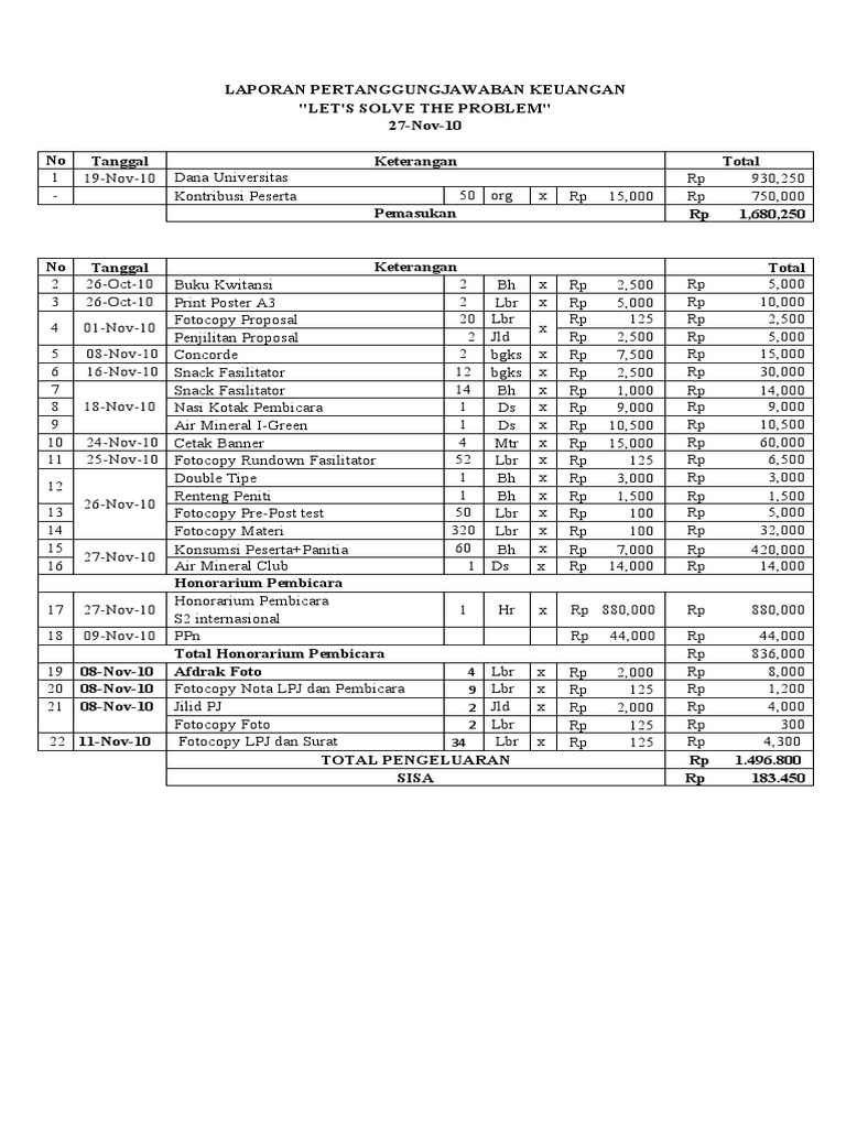 Contoh laporan pertanggungjawaban dana kegiatan. Laporan Pertanggungjawaban - Kegiatan Dana Hibah Daerah ... laporan pertanggungjawaban - kegiatan dana hibah daerah setda kab. bantul tahun 2012 Laporan Pertanggungjawaban Kegiatan Gathering Isi Laporan Pertanggungjawaban Kegiatan. HALAMAN JUDUL. I. NOMOR DAN NAMA KEGIATAN. Nomor : 05/HMP-AN/UPB/X/2017. Nama Kegiatan : Family Gathering Adimistrasi Negara 2017 "Bersama. Menjalin Kebersamaan". II. TUJUAN. 1. DOCX Laporan Pertanggungjawaban Kegiatan LAPORAN PERTANGGUNGJAWABAN BANTUAN DANA BANJIR BANDANG DAN TANAH LONGOR MANADO 15 JANUARI 2014 INDONESIA SEJAHTERA 20 14 PENDAHULUAN ISRA (Integrated Society Rescue Action) merupakan wadah organisasi yang dibentuk berdasarkan visi yaitu menjadikan bangsa Indonesia sebagai bangsa yang jaya, makmur sejahtera seutuhnya. Contoh Laporan Pertanggungjawaban Dana Bantuan Sosial ... Contoh laporan pertanggung jawaban lpj bantuan dana desa kata pengantar dengan memanjatkan fuji dan syukur kehadirat alloh swt atas segala rahmat dan karunia nya kami dapat menyelesaikan program kegiatan sebagaimana yang kita harapkan dengan telah selesainya pelaksanaan kegiatan bantuan dana desa tahap 1 tahun 2015.
